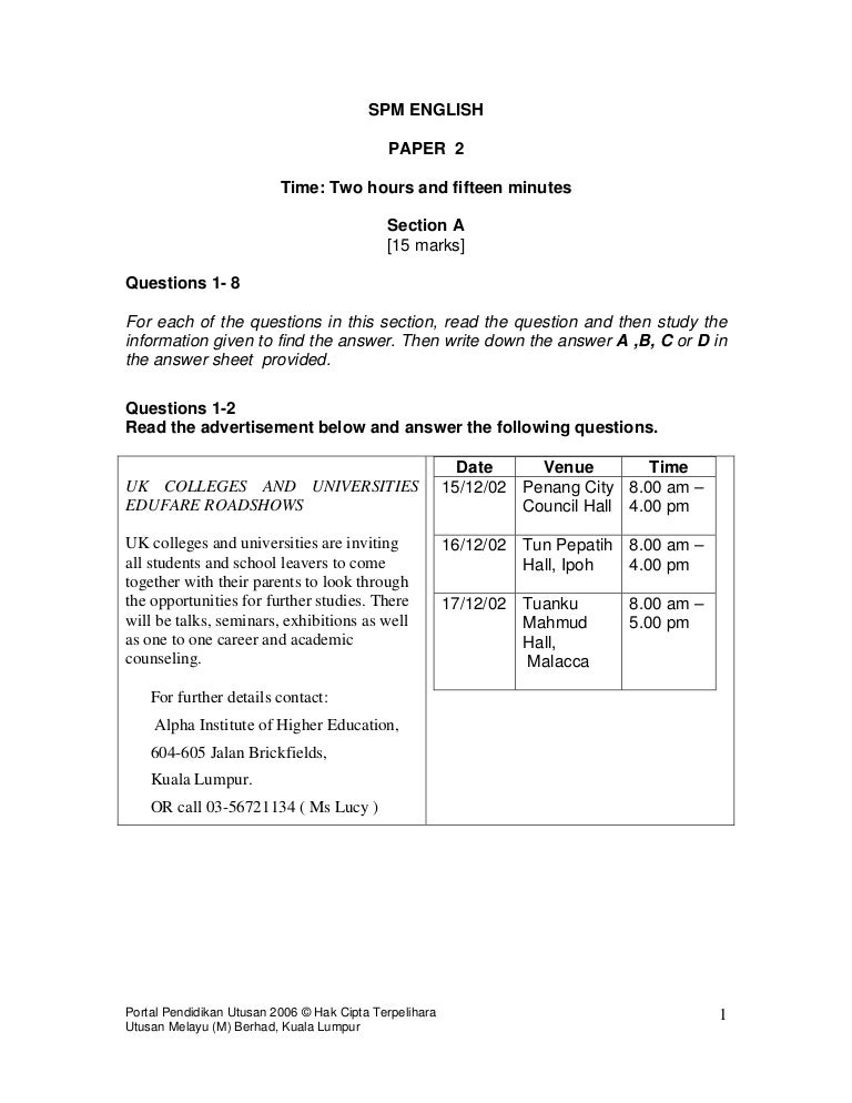 We provide SPM Trial Paper Questions with answers and Soalan Percubaan SPM from 2011-2018. Calon yang tidak dapat menduduki mana-mana kertas peperiksaan bertulis atau melaksanakan ujian lisan khusus calon persendirian akan dianggap TIDAK HADIR bagi mata. SPM 2012 BAHASA MELAYU Paper 1 2 SPM 2012 ENGLISH LANGUAGE Paper 1 SPM 2012 ENGLISH LANGUAGE Paper 2.